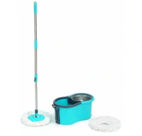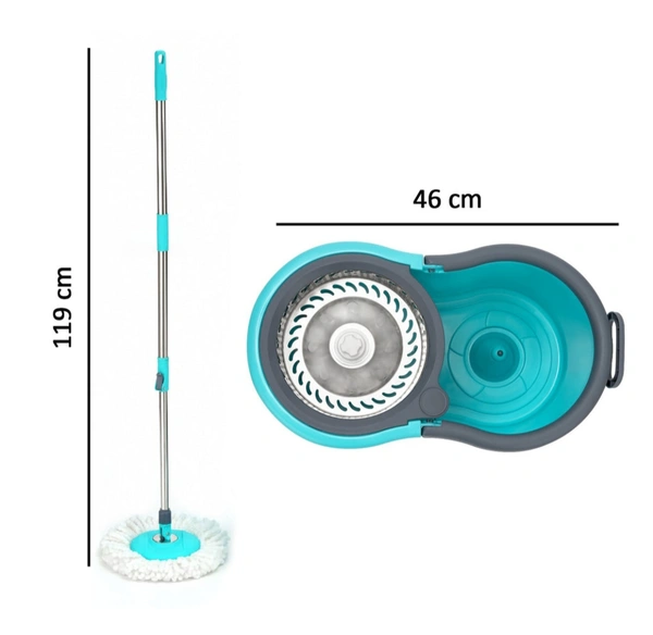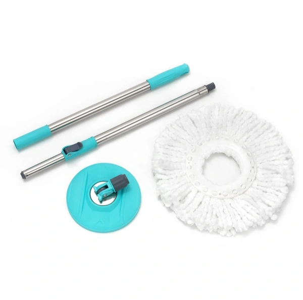 100% polyester highly absorbent fibre mop with 360-degree spinning and adjustable height, ensuring deep cleaning and ease of wringing.